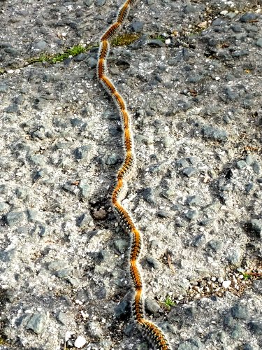 A cautelar distancia de la dañina procesionaria, y con el propósito de preservarse de los filamentos urticantes que, cercanos al medio millón, lanzan al aire cada uno de los minúsculos combatientes, Mam’zelle se enfundó gorra, gafas, y guantes, además de cubrirse la mitad inferior del rostro con un fular y calzarse unas botas de senderismo de suela recia; de tal guisa, se aproximó a la cadena viviente, que continuaba su perezosa marcha prolongándose más conforme alcanzaban el suelo las últimas unidades defoliadoras que se retiraban del árbol.