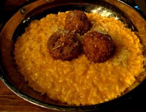 Finalizada la conferencia, la oradora y un pequeño grupo de asistentes a la charla se dirigieron al bar del Salón Social, donde Olarieta, la cocinera, les había preparado un gustoso risotto de calabaza con albóndigas de confit de pato.