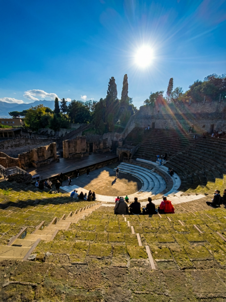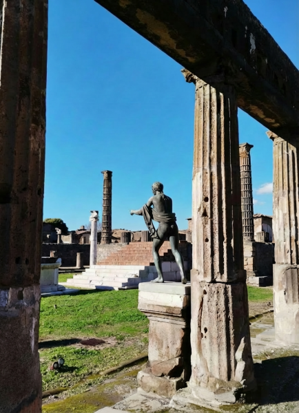 No han quedado fuera de su itinerario ninguno de los dos Teatros; ni los Templos dedicados a dioses y diosas (Júpiter Meliquios, Apolo, Isis, Fortuna Augusta…); ni la Necrópolis, situada en las afueras, en la Via delle Tombe; ni las Termas, muy bien distribuidas, con zonas separadas para cada sexo; ni la Palestra, el campo de entrenamiento deportivo para jóvenes y gladiadores.